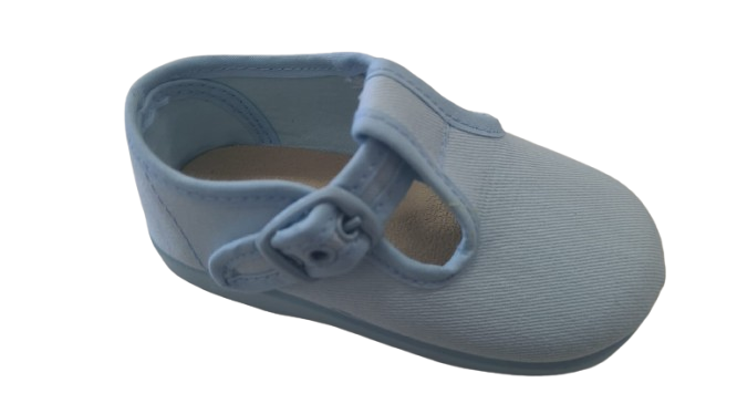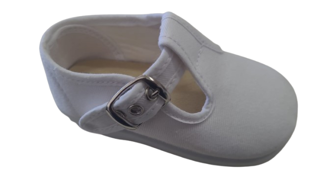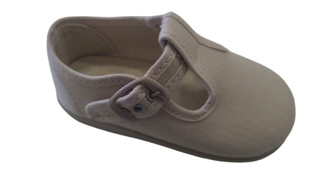 Fabricado en lona resistente y transpirable, este zapato incorpora un cierre de hebilla metálica que asegura una sujeción adecuada. Su interior cuenta con una plantilla acolchada para mayor comodidad y una suela de goma flexible y antideslizante, perfecta para los primeros pasos o el uso diario.