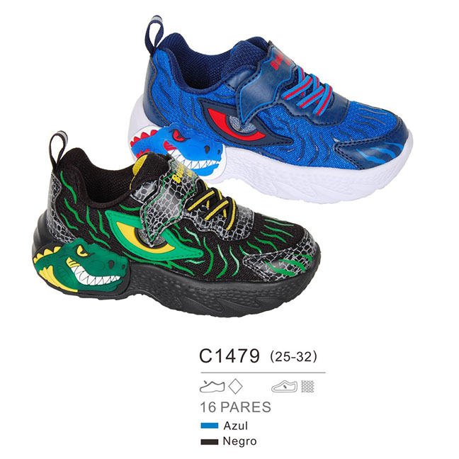 Las zapatillas con luz para niño modelo C1479 de bubble destacan por su espectacular diseño de dinosaurio en 3D. Disponibles en azul y negro, ofrecen una estética llamativa y divertida que no pasará desapercibida.