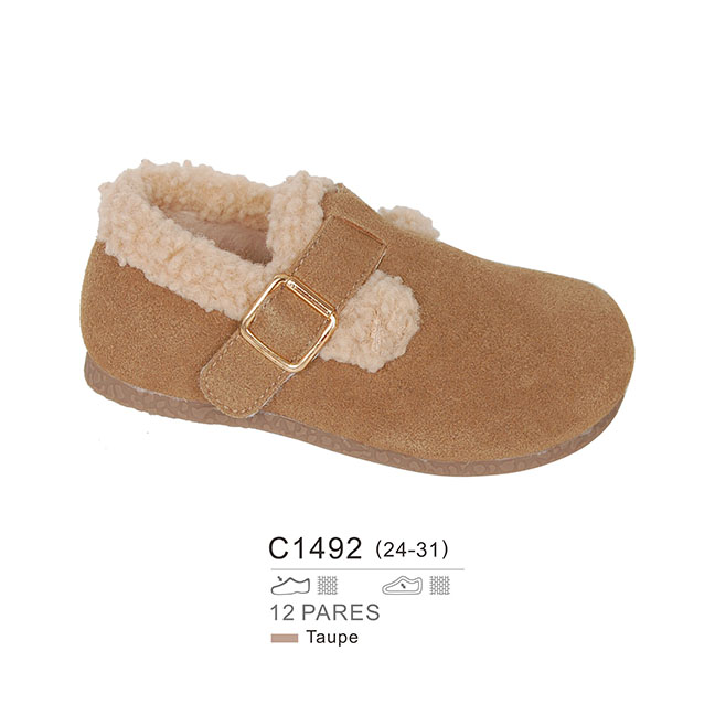 El modelo C1492 de bubble es un zapato tipo zueco afelpado, perfecto para mantener los pies abrigados durante el invierno. Su diseño con hebilla metálica y forro interior mullido aporta tanto estilo como comodidad.